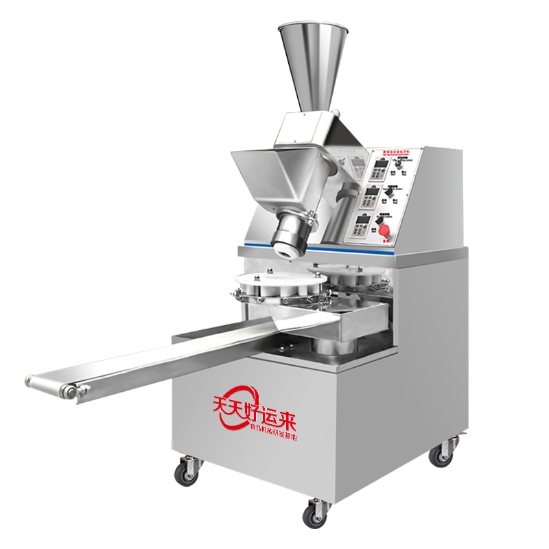 多功能包子機采用螺旋式推面方式,由模具控制面皮的厚薄。面斗中的面由供面調系統,將面送至機頭出口處,形成含餡的面柱后由成型盤內的成型塊將面柱擠斷成大小均勻的包子。全機的工作部分主要由:送面系統、送餡系統、機頭、成型盤、輸送帶五部分組成。工作流程:供餡料斗-〉供面斗)-〉加餡加面-〉切斷成型-〉傳送帶-〉醒發-〉蒸制;優勢:采用雙絞龍,螺旋揉面推進出面,大螺徑,緩慢勻速出面,面皮受力小,供面速度可調。餡管采用半臥式或立式餡斗裝置,立式有利于改大顆粒餡料的流通,在制作較稀餡料時可采用半臥式餡斗下均勻。 可加配值可生產:餡餅和方型饅頭、圓饅頭等。成型盤采用軸承傳送,配合刀塊張合防止以前包子機做大包子成型堵面現象。有9褶或12褶和16褶花型供用戶選擇,進口高分子材料刀塊利用科學原理均衡受力減小,解決了其它包子機成型刀塊靠一塊主刀推動其它副刀運動易磨損,刀夾面粘面,易受天氣變化而熱脹冷縮不能正常生產的難題,促進機器穩定延長使用壽命。免費培訓包子制作技術、及速凍生胚技術;